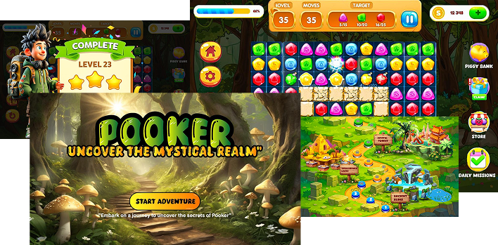 In the mystical realm of Pooker, ancient magic has awakened, and the land is filled with hidden treasures and mysterious creatures. Players take on the role of a brave adventurer, tasked with exploring the realm, collecting treasures, and uncovering the secrets of Pooker.